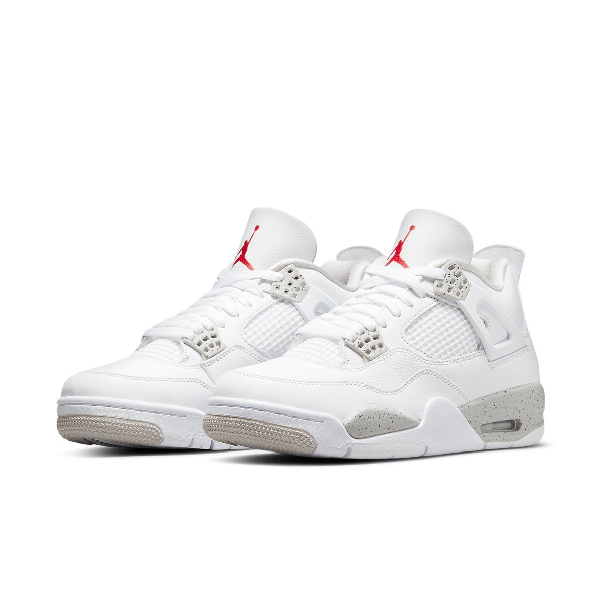 This Air Jordan 4 features an all-White tumbled leather upper detailed with speckled Cement Grey on the plastic eyelets and midsole. Moreover, branding comes in the form of Jumpman logos at the tongue and outsole atop a White rubber sole completes the design.