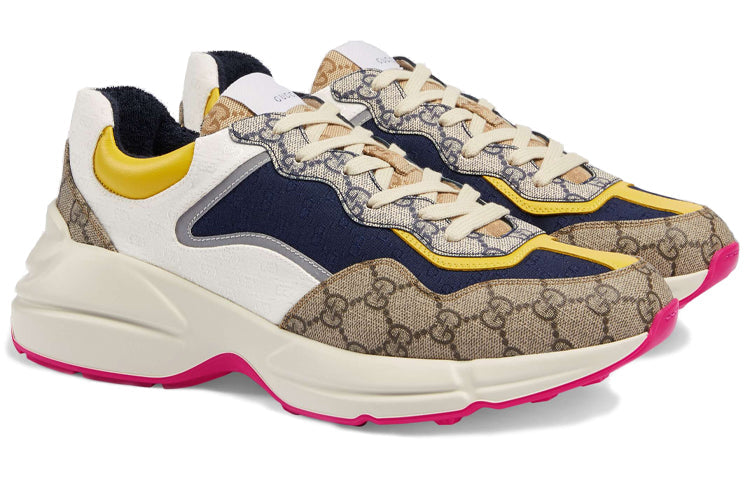 Gucci's signature Rhyton silhouette is showcased in these sneakers, offering a chunky, oversized profile that exudes modern luxury. The exaggerated sole not only provides exceptional comfort and support but also adds a bold statement to your outfit. The blend of beige, white, and yellow enhances the sneakers' visual appeal, making them a standout piece.